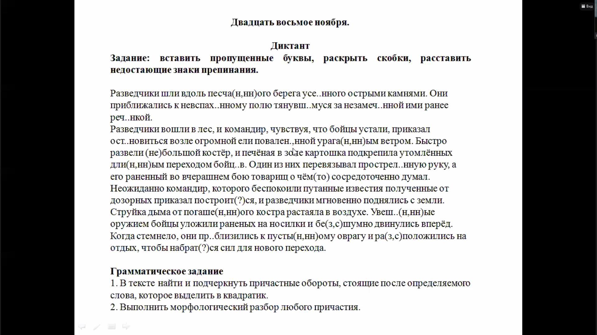 Песчаного, усеянного, невспаханному тянувшемуся, незамеченной, реченькой, остановиться, поваленной, ураганным, небольшой, длинным, бойцов, простреленную, чём-то, построиться, погашенного, увешанные, бесшумно, приблизились, пустынному, расположились, набраться,