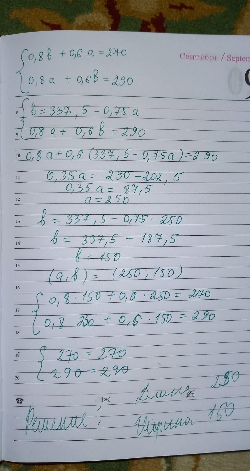 Брат и сестра измерили шагами длину и ширину огорода прямоугольной формы. Когда брат шел по длинной стороне, а сестра по короткой стороне прямоугольника, они сделали вместе 270 шагов. Потом брат шел по короткой стороне, а сестра по длиной стороне огорода, и тогда они вместе сделали 290 шагов. Длина шага брата равна 0,8 м, а длина шага сестры 0,6. Чему равна площадь огорода?