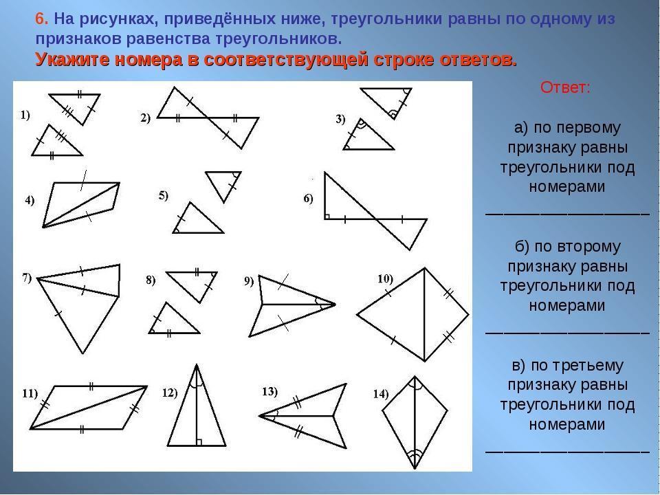 на рисунке равные по 1, 2 и 3 признаку равенства треугольников ,укажите номера этих треугольников в ответе