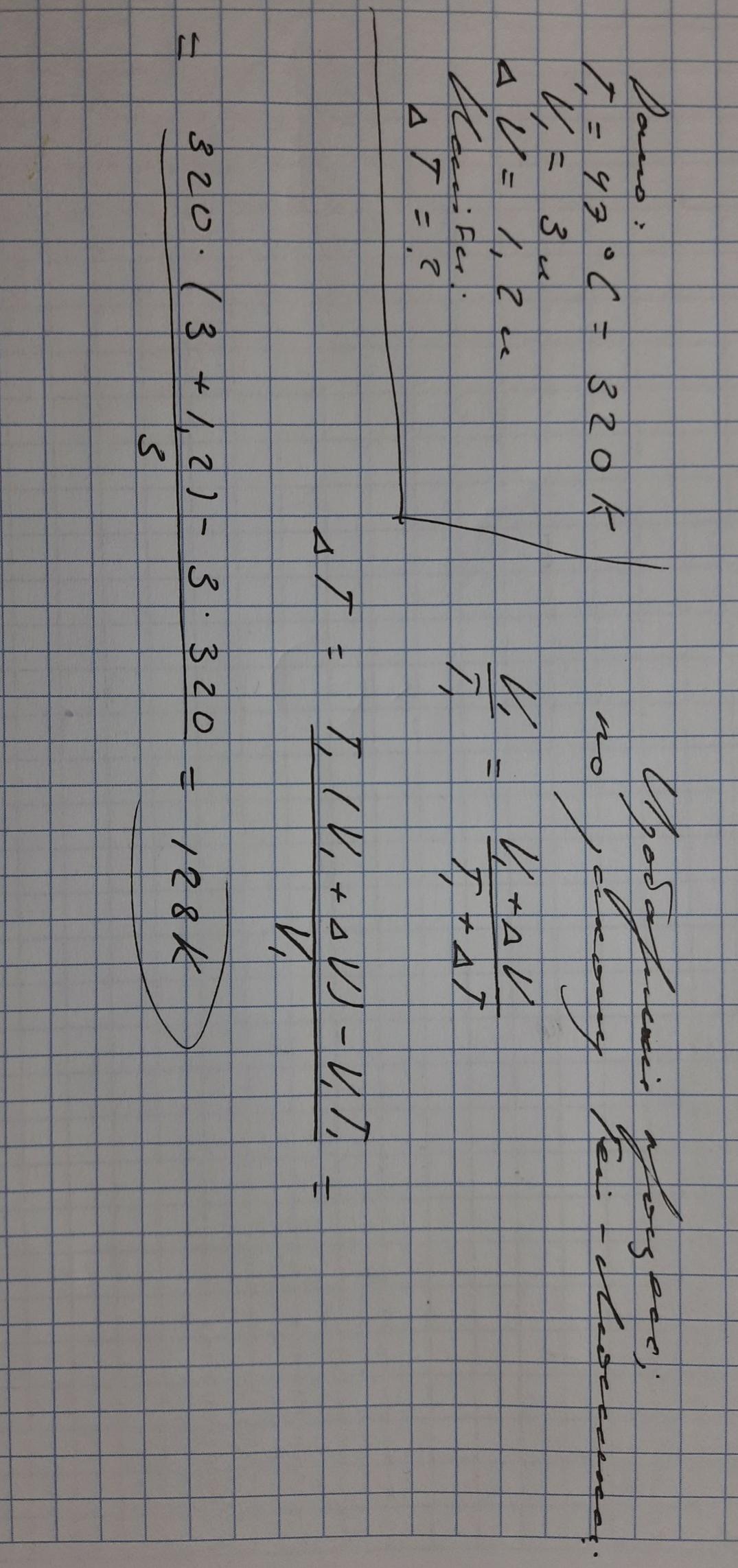 при температуре 47°С газ занимает обьем 3л. на сколько надо поднять температуру при постоянном давлении,чтобы обьем увеличился на 1,2л?