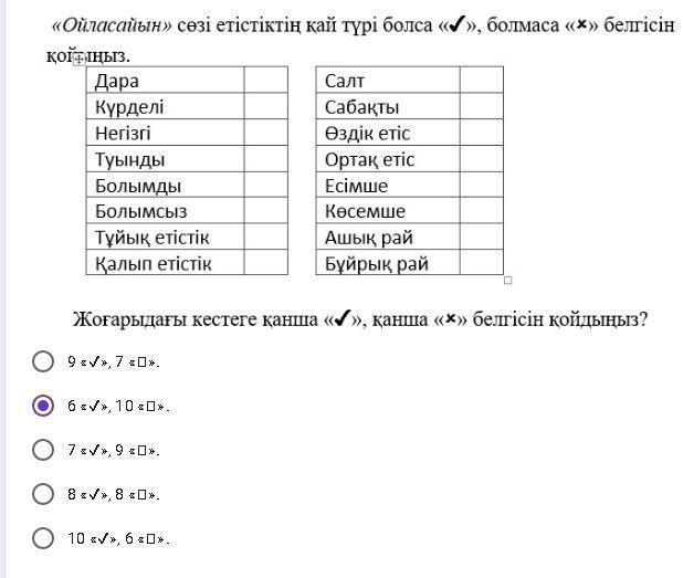 Ответ:дара, негізгі, толымды, қалыпты етістік, өздік етіс, көсемше ✔ қалғандары дұрыс емес деп ойлаймын❌