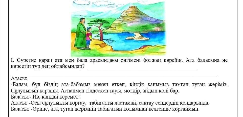 Атасы баласына табиғат сұлулығы туралы айтып отыр. Туған жерінің табиғатының қаншалықты көз тойма сұлу екенін және сол жерді қолынан келгенше қорғау керек екенін түсіндіріуде....)