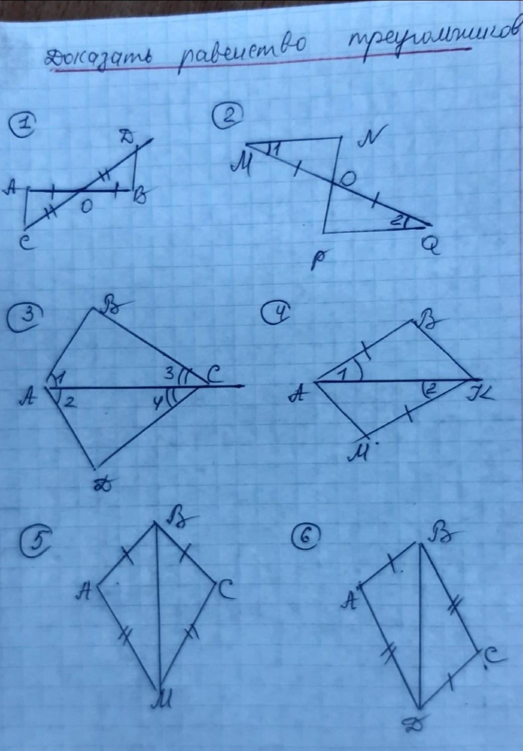Вам надо скопировать каждый рисунок. Увидеть пару равных треугольников и доказать это. Дано и найти не пишите. Сразу, рисунок, доказательство. При этом равные стороны помечены и если углы названы, например 1 и 2, то это значит они равны. Конкретнее. Равные углы взяла дугами! Как мы это обычно делаем. Помните, мы пишем