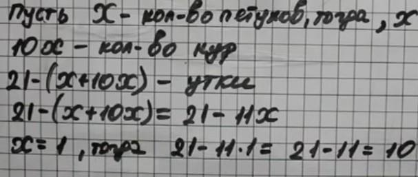 если в 10 раз меньше, то у нас 1 петух.(если было бы 2 петуха, то уток/куриц было бы уже 20, а у нас только 21)