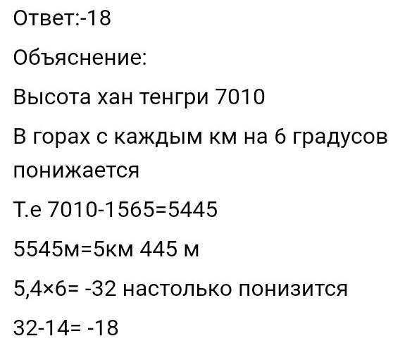 4. Если летом в горах Тянь-Шаня на высоте 1565 метров температура равна +14°С , то какая температура будет на вершине пика Хан-тенгри?