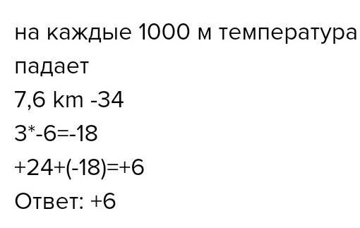 3)На каждые 1000 м температура падает => 1)7,6 km -34 2)3*-6=-18 3)+24+(-18)=+6 Ответ: +6