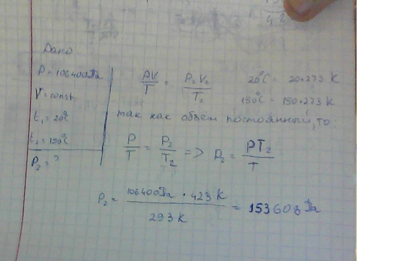 Народ помогите! Давление газа при 20°C равно 106400Па. Каково будет давление газа, если его нагреть при постоянном объеме до 150° C?