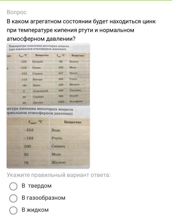 Температура плавления цинка 419.5 градусов,а ртуть кипит при 357 градусов,значит цинк находится в твердом твердом агрегатном состоянии.