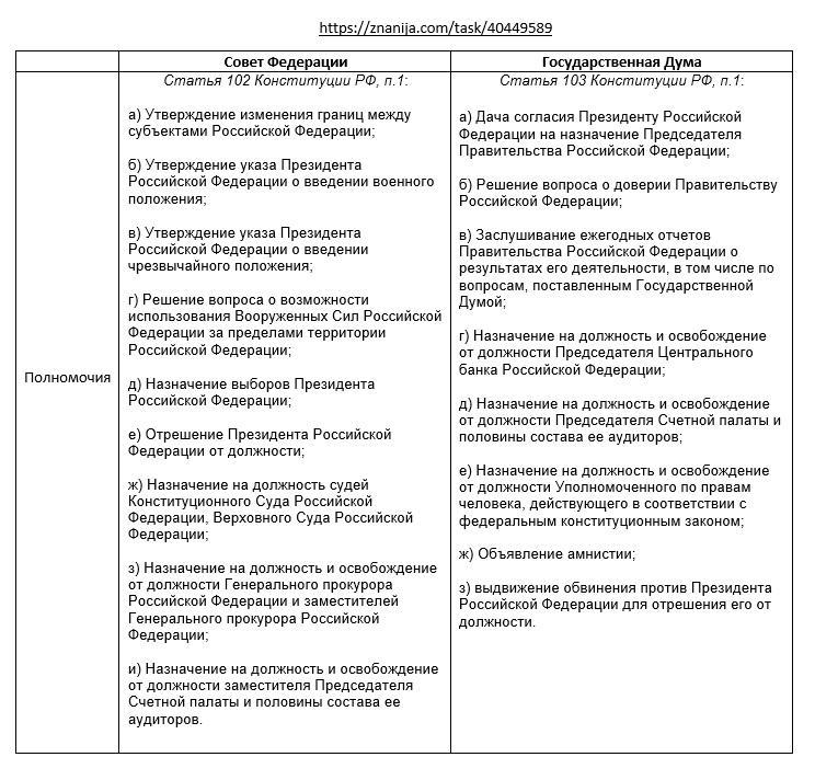 Выписать из Конституции РФ полномочия Федерального Собрания РФ. Оформить в виде таблицы: первый столбик Совет Федерации, второй Государственная Дума