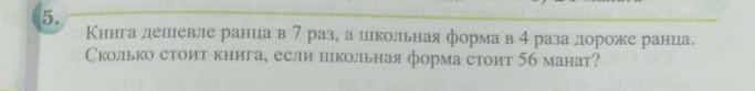 Что нам известно? Нам известно что книга дешевле ранца, то есть её стоимость в 7 раз меньше нежели ранца. А школьная форма дороже ранца в 4 раза, и нам известна её стоимость: 56 маннат.