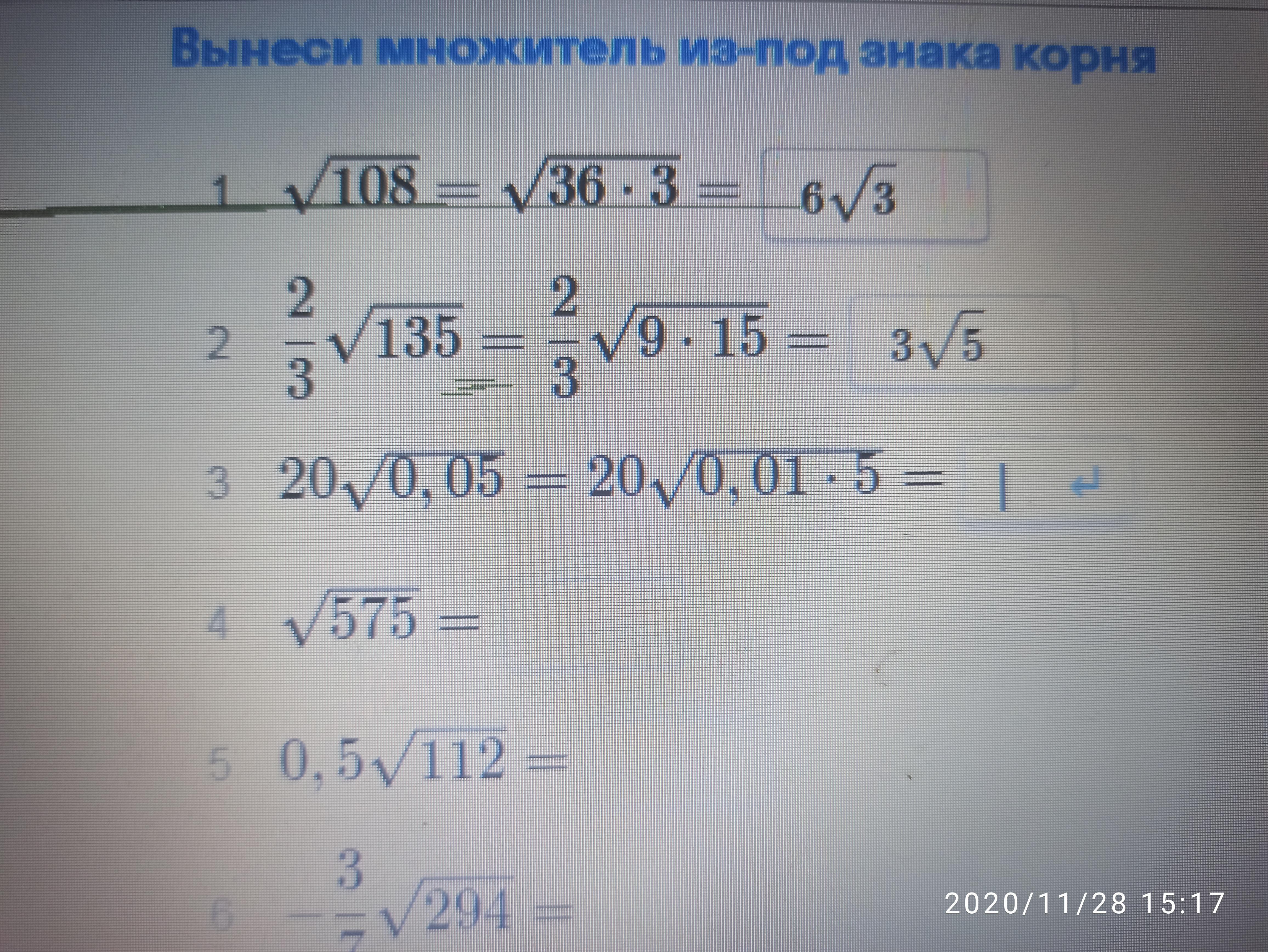 3) 20 корень 0.05=20 корень 0.01*5= 20*0.1 корень 5= 2 корень 5