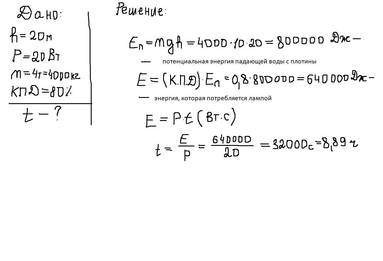 Высота плотины гидроэлектростанции (ГЭС) составляет 20 м. Сколько часов может светить лампа мощностью 20 Вт при прохождении через плотину 4 т воды? КПД ГЭС равен 80%