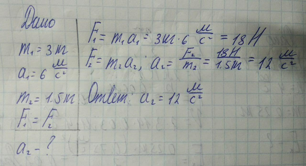 3.Сила сообщила телу массой 3кг ускорение 6м\с2, какое ускорение эта же сила сообщит телу массой 1.5кг.Решите срочно, с подробным решением