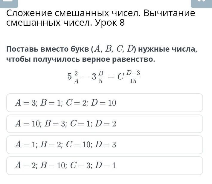 A=3;B=1;C=2;D=10. 5+2/3-(3+1/5)=2+7/15. Задачу можно решить чисто подбором, и первый же вариант - правильный. Причём во втором и четвёртом вариантах получается отрицательный числитель в правой дроби, а в третьем и четвёртом вариантах - числители больше знаменателей в левой и центральной дробях соответственно.