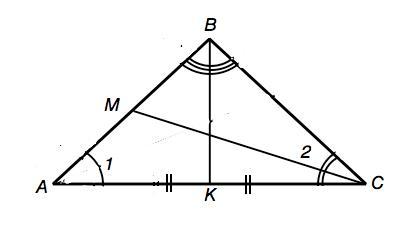 Объяснение: Отметим на рисунке дополнения согласно условию задачи и рассмотрим треугольник АВС. По условию ВК - биссектриса, Она же - медиана, т.к. СК=1/2 АС (дано). Если биссектриса угла треугольника совпадает с медианой из той же вершины, этот треугольник - равнобедренный с основанием АС. В равнобедренном треугольнике углы при его основании равны. =>
