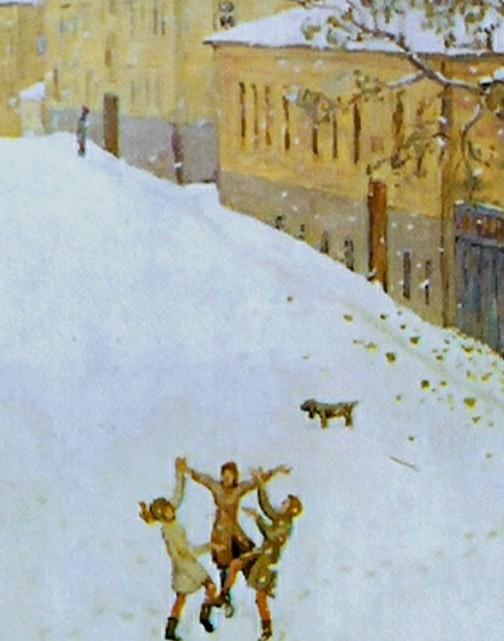 Наступила зима. Всё вокруг стало белоснежно. Дети играют во дворе, играют в снежки,прятки,водят хороводы. А беленький котёнок стал вообще не виден, только чёрненькие глазки на снегу виднеются. Ну а пёс как обычно бубнит себе под нос.