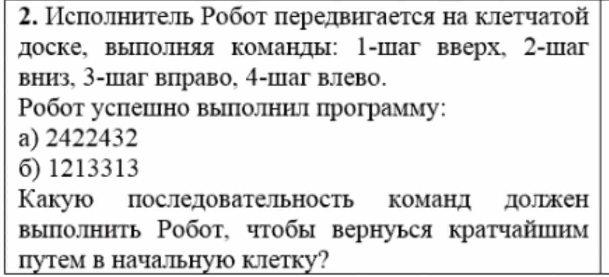 a) 2422432 б) 1213313 Какую последовательность командолжен выполнить Робот, чтобы вернуься кратчайшим путем в начальную клетку?