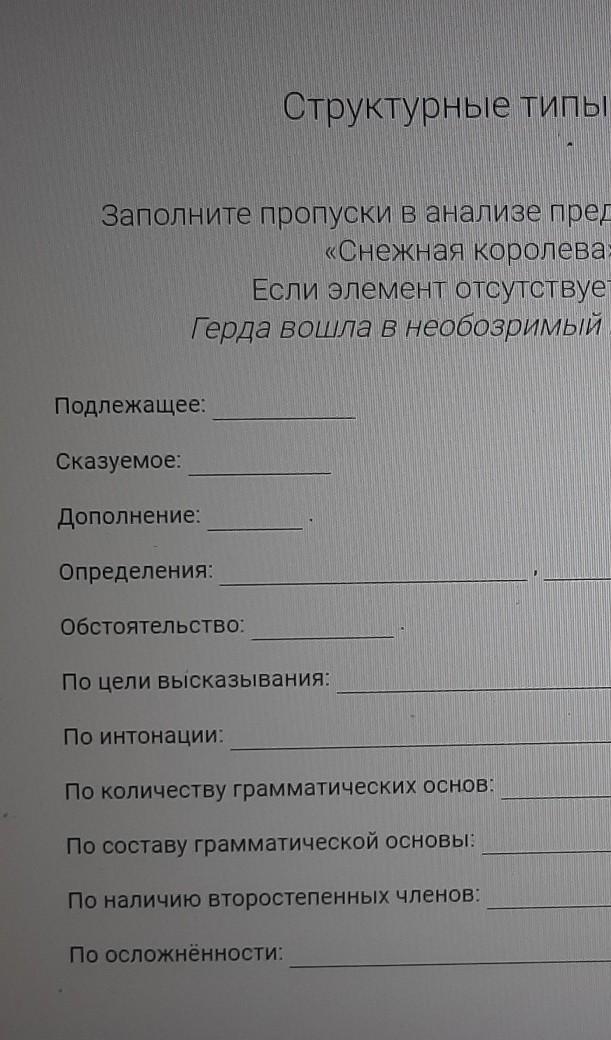 Пожалуйста помогите, заполните пропуски в анализе предложения. Фрагмент из сказки Снежная Королева. Герда вошла в необозримый пустынный ледяной зал