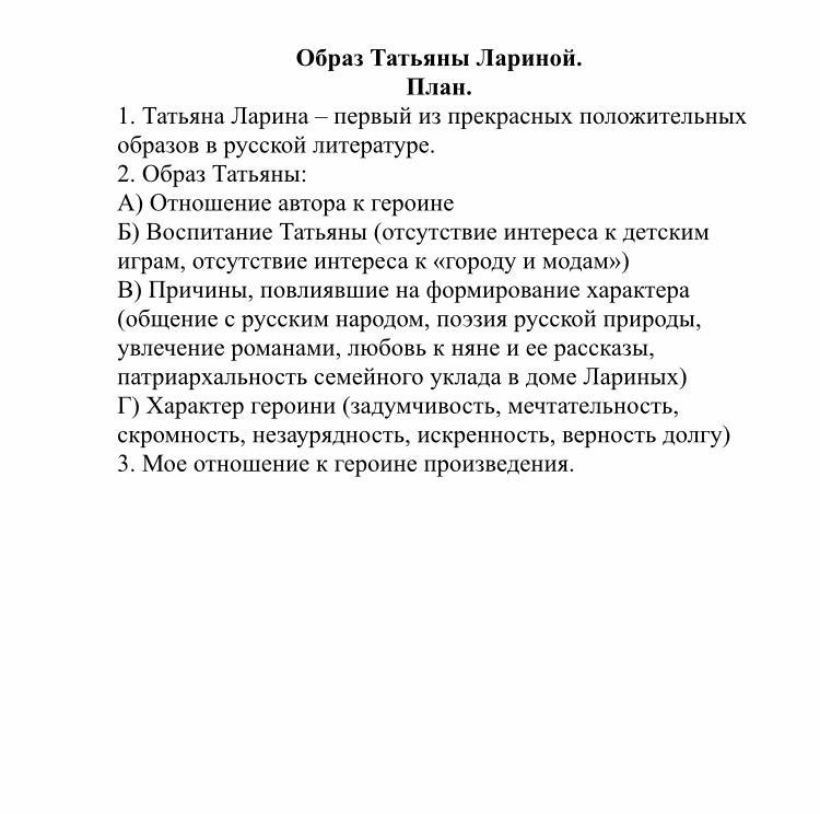 Г) Татьяна очень чувствительная, романтичная, искренняя. При этом она не побоялась признаться Онегину в своих чувствах. Татьяна была верной своему мужу, даже когда Евгений чуть ли на коленях приполз к ней.