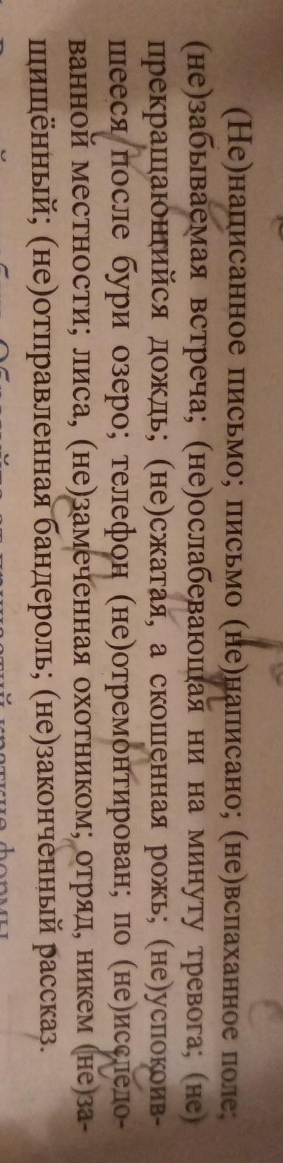 Ненаписанное письмо; письмо не написано; невспаханное поле, незабываемая встреча; не ослабевающая ни на минуту тревога, непрекращающийся дождь; не сжатая, а скошенная рожь; не успокаившееся после бури озеро; телефон не отремонтирован; по неисследованной местности; лиса, не замеченная охотником; отряд, никем не защищённый; неотправленная бандероль; незаконченный рассказ.