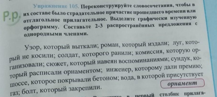 Вытканный узор; изданный роман; нескошенный луг; раненый(прилаг.) солдат; организованная комиссия; сюжет, навеянный воспоминаниями; расписанный орнаментом сундук; премированный инженер; шоссе, покрытое бетоном ; газированная вода; закрепленный болт.