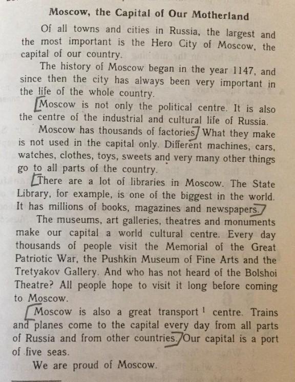 Москва, столица нашей Родины Из всех городов России самым большим и важным является город-герой Москва, столица нашей страны. История Москвы началась в 1147 году, и с тех пор город всегда играл очень важную роль в жизни всей страны. Москва - не только политический центр. Это также центр промышленной и культурной жизни России. В Москве тысячи фабрик / То, что они производят, используется не только в столице. Разные машины, машины, часы, одежда, игрушки, сладости и многое другое едут во все уголки страны. Там библиотека, например, одна из самых больших в мире. В нем миллионы книг, журналов и газет. Музеи, художественные галереи, театры и памятники делают нашу столицу мировым культурным центром. Ежедневно тысячи людей посещают Мемориал Великой Отечественной войны, Государственный музей изобразительных искусств им. А.С. Пушкина и множество библиотек Москвы. Государственная Третьяковская галерея. А кто не слышал о Большом театре? Все надеются побывать здесь задолго до приезда в Москву. Москва также является отличным транспортным средством, и самолеты ежедневно прибывают в столицу со всех концов России и из других стран. / Наша столица - порт пяти морей. центр. Поезда Мы гордимся Москвой.