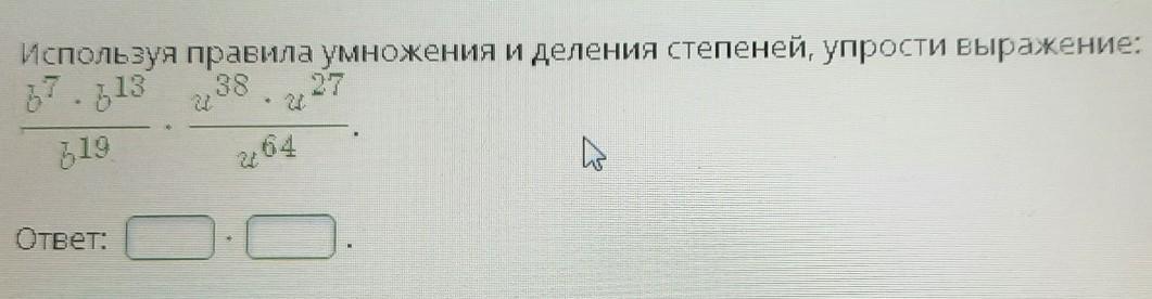 ((b^7*b^(13))/(b^(19))) * ((u^(38)*u^(27))/(u^(64)) = b^(7+13-19)*u^(38+27-64)=b^1 * u^1 = bu