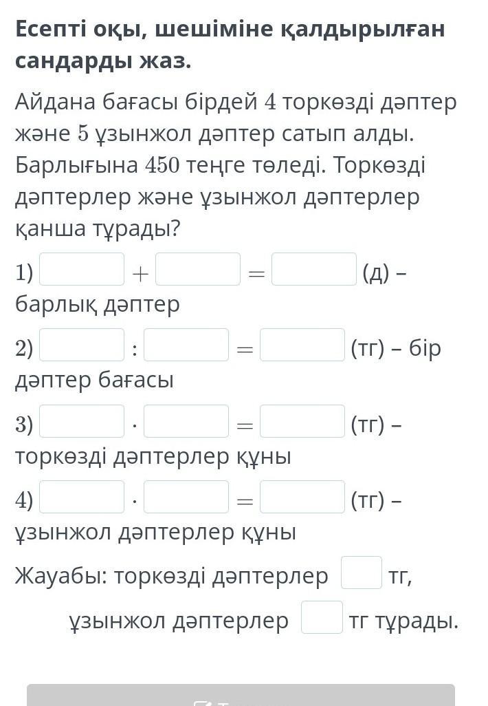 Жауабы: торкөзді дәптерлер 200 тг, ұзынжол дәптерлер 250 тг тұрады.