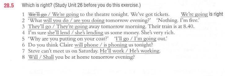 2) are you doing 3) they're going 4)she'll lend 5) i'm going out 6) will phone 7) he's working 8) will