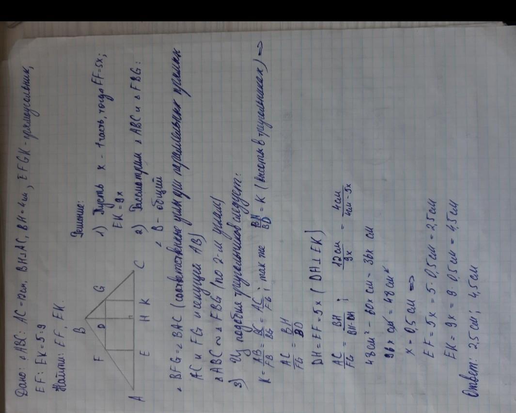 В треугольник с основанием 12 см вписан прямоугольник, стороны которого равны 8 см и 5 см. Большая сторона прямоугольника принадлежит основанию. Найти высоту треугольника, проведённую к основанию?