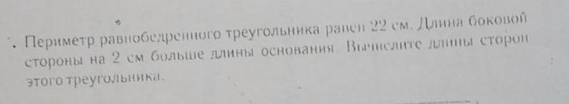 Дано: P=22 см и длина стороны на 2 см больше длины основания. Найти:длины сторон прямоугольника. Решение:Пусть две равнобедренных сторон треугольника являются: буквой (а)и(b) . Если каждая буква из а и b больше основания на 2 см то значит их в двое больше. 1) 22-(2+2)=18 (см). 2) 18:3=6 (см) основание. 3) 6+2=8(см)стороны а и b. Ответ:Две равнобедренные стороны а и b равны 8 см, а основание 6см