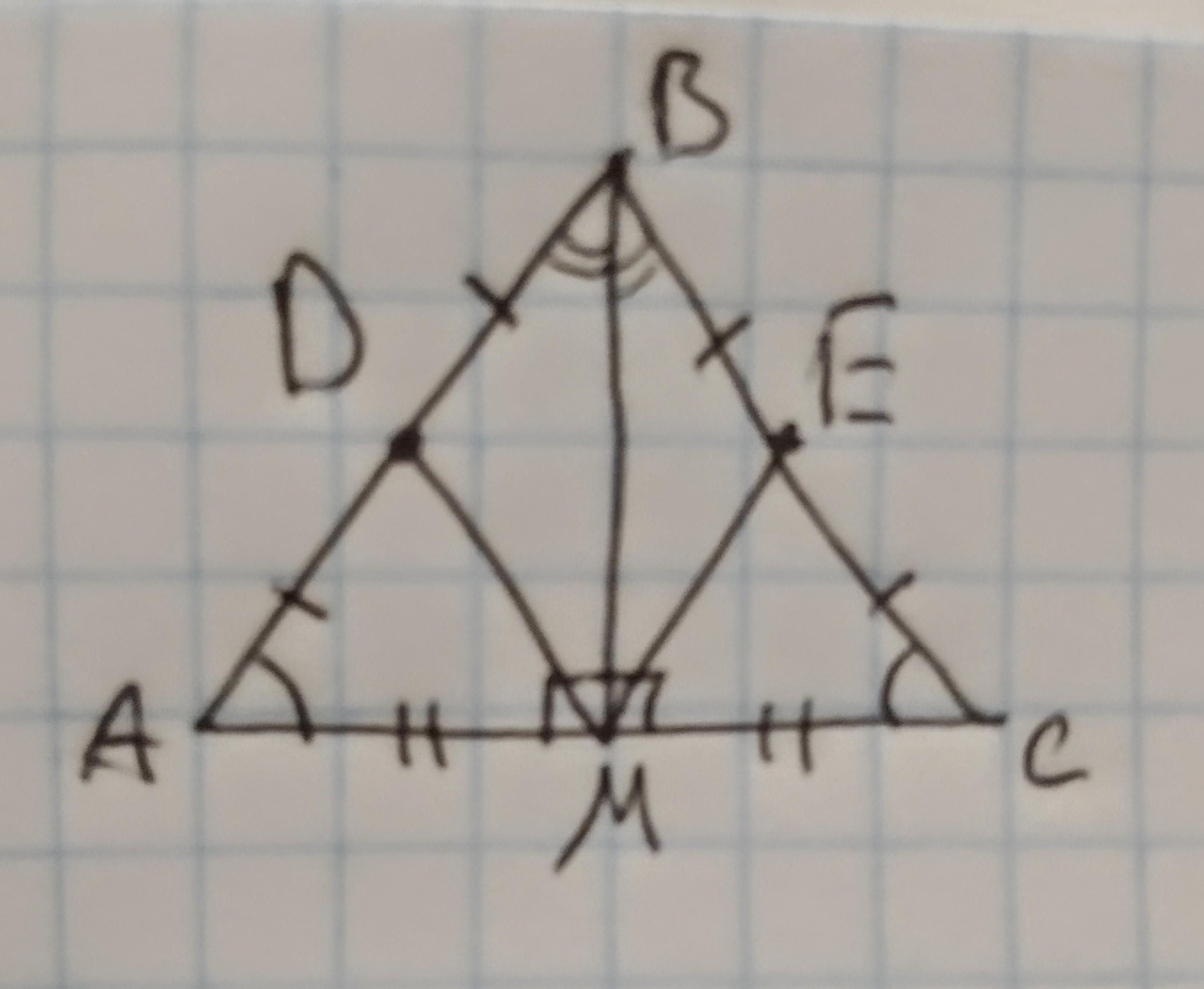 Дано: АВС - рівнобедренний трикутник. ВМ - висота. D i E - середини АВ і ВС.