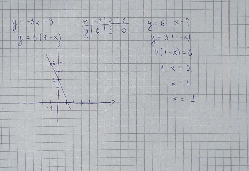 Постройте график функции y=-3x+3 Укажите с помощью графика при каком значение x значение y равно 6