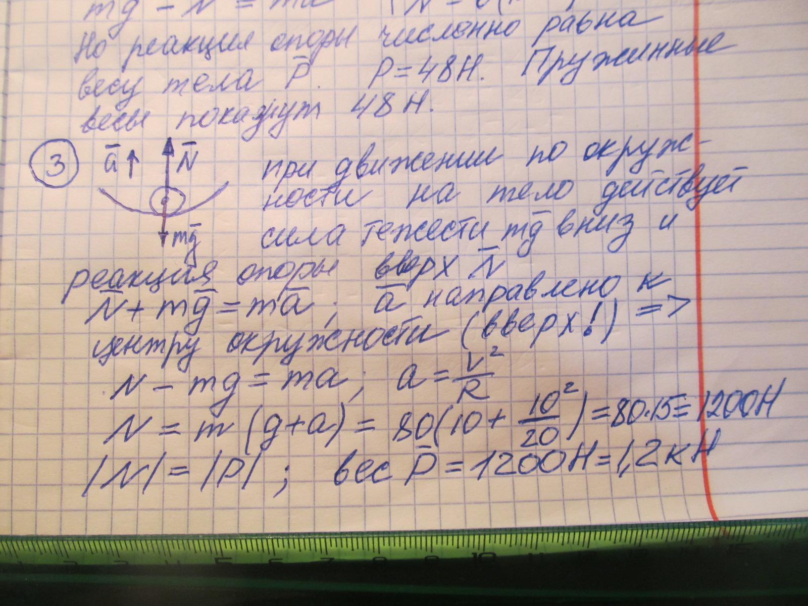 3. Велосипедист массой 80 кг. движется со скоростью 10 м/с по вогнутому мосту,имеющему радиус кривизны 20 м. Чему равен вес велосипедиста в момент прохождения нижней точки моста?
