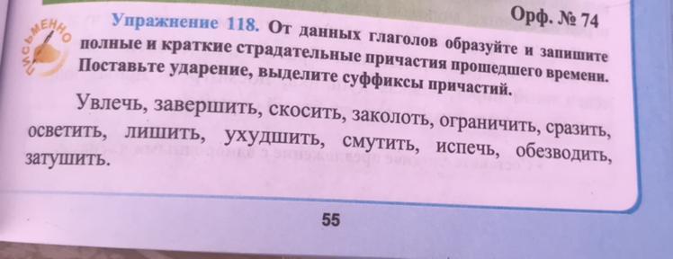 Увлеченный-увлечен; завершенный-завершенА; скОшенный-скошенА; закОлотый- закОлот; огранИченная- ограченА; сражЁнный-сражЁн; освещЁнный-освещЁн; лишЁнный-лишенА; ухудшЁнный-ухудшенА; смущЁнный-смущЁН; испечЁнное-испеченО; обезвОженный-обезвОжена; затушенный-затУшен.