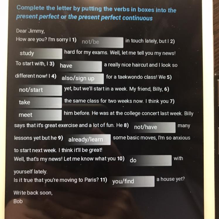 1.haven't been 2.have been studying 3.have had 4.also have signed 5.haven't started 6.has been taking 7.has met 8.hasn't had 9.has already learnt 10.have done 11.Haven't you found