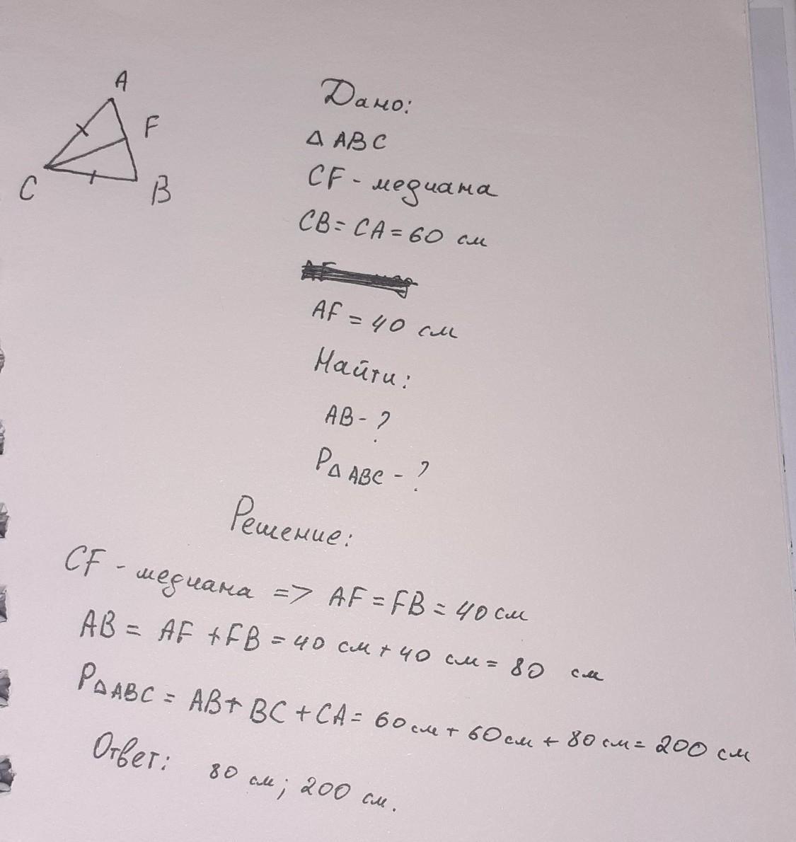 Вычисли периметр треугольника CAB и сторону AB, если CF — медиана,