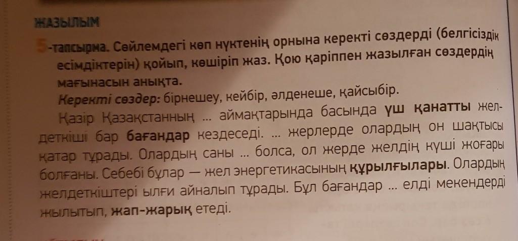 Жазылым: 78-бет 5-тапсырма. Сөйлемдегі көп нүктенің орнына керекті