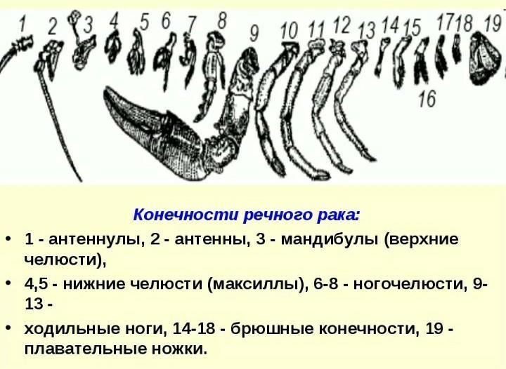 сколько у речного рака: мандибул, антеннул, антенн, максилл, ногочеллюстей, половых ног, плавательный ног, пара ног входящая в состав хвостового плавника?