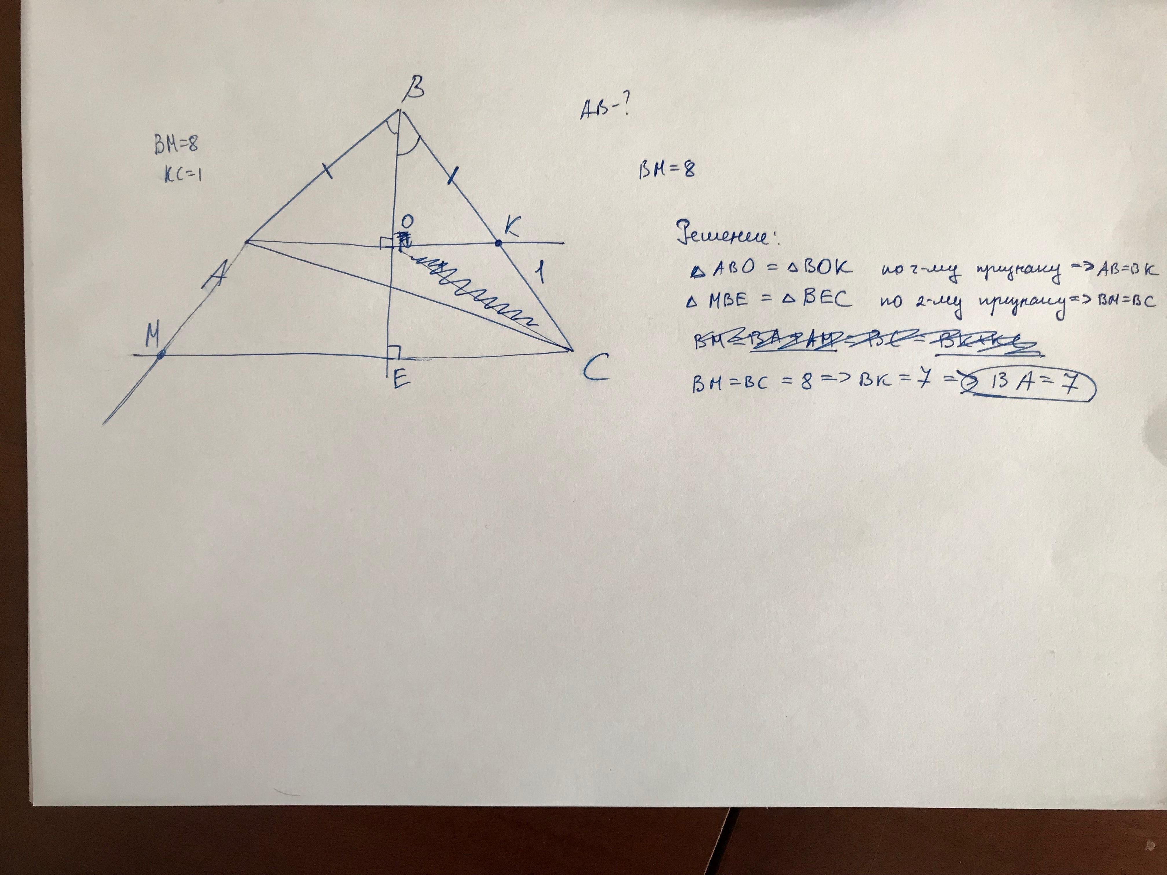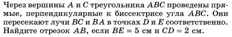 через вершины а и с треугольника авс проведены прямые перпендикулярные биссектрисе угла авс. Они пересекают лучи ВС и ВА и точках D и К соотвественно. найдите отрезок AB, если ВЕ = 5 см м СВ = 2 СМ