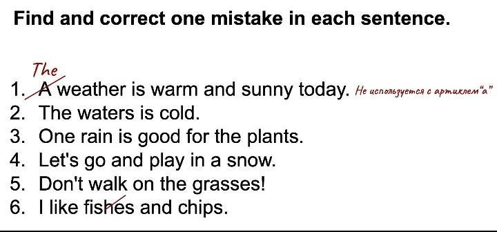 4. Let's go and play in snow – неопределённый артикль не может стоять перед неисчисляемым существительным.