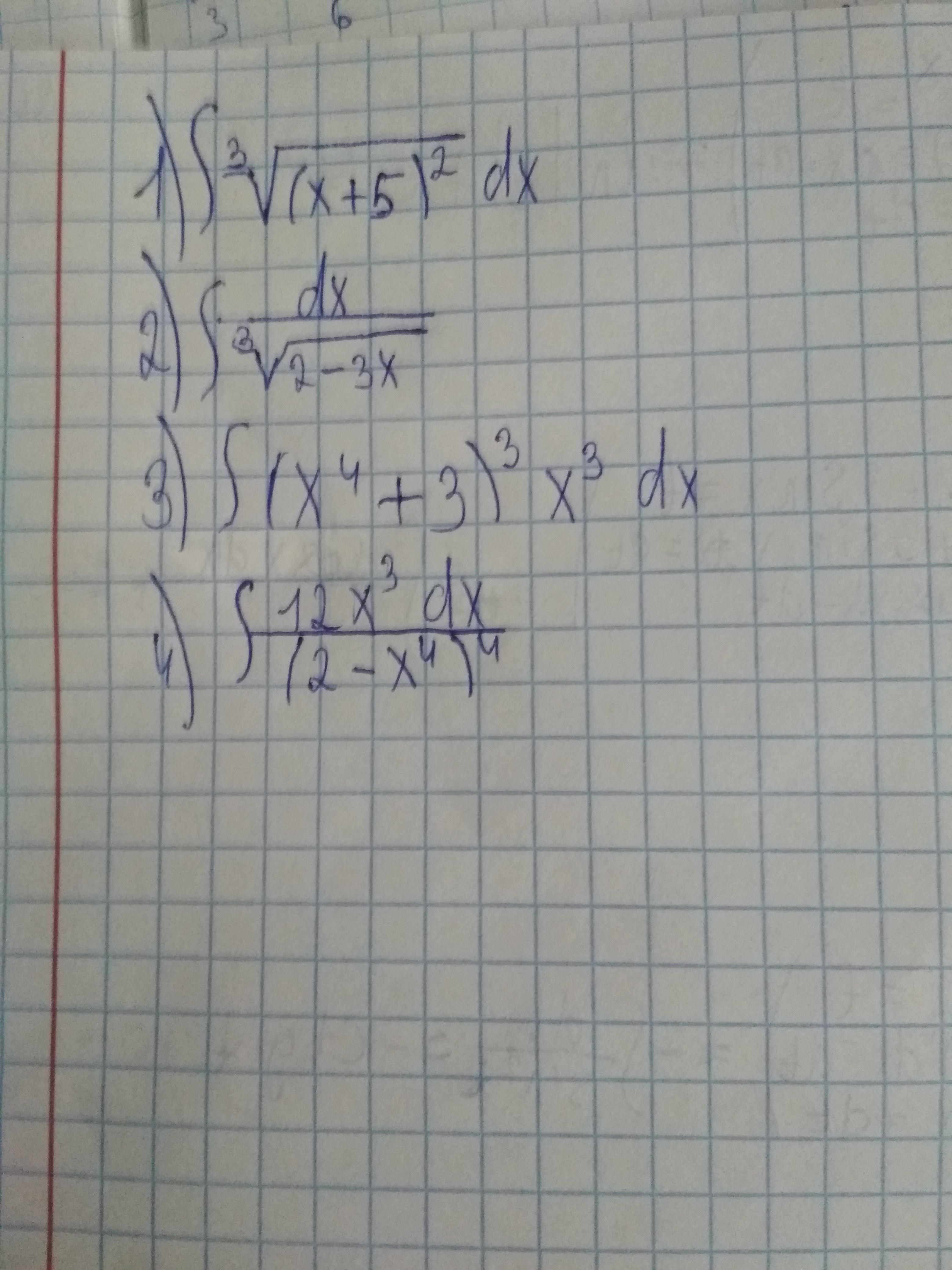 1)\ \ \int \sqrt[3]{(x+5)^2}\, dx=\dfrac{3\, (x+5)^{5/3}}{5}+C=\dfrac{3}{5}\cdot \sqrt[3]{(x+5)^5}+C\\\\\\2)\ \ \int \dfrac{dx}{\sqrt[3]{2-3x}}=\dfrac{3\, (2-3x)^{2/3}}{-3\cdot 2}+C=-\dfrac{1}{2}\cdot \sqrt[3]{(2-3x)^2}+C\\\\\\3)\ \ \int (x^4+3)^3\cdot x^3\, dx=\dfrac{1}{4}\int \underbrace {(x^4+3)^3\cdot 4x^3\, dx}_{u^3\, du}=\Big[\ d(x^4+3)=4x^3\, dx\ \Big]=\\\\\\=\dfrac{1}{4}\cdot \dfrac{(x^4+3)^4}{4}+C