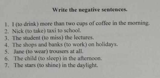 1 don't drink 2 doesn't take 3 doesn't miss 4 don't work 5 doesn't wear 6 doesn't sleep 7 don't shine