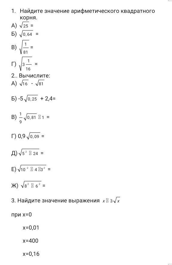 1) А) 5: Б) 0.8; В)1/9;Г)7/4 2) а) 4-9=-5 б)-5*5+2.4= -22,6 в)1 г)0.027 д)10корень6 е)27000 ж)2304