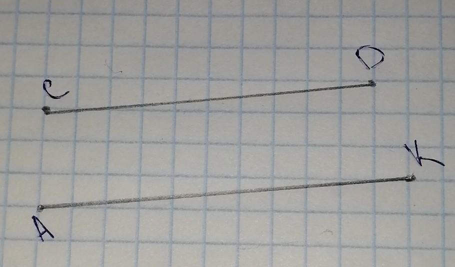 С помощью треугольника и линейки построй прямую, параллельную данной прямой CD и проходящую через точку K.