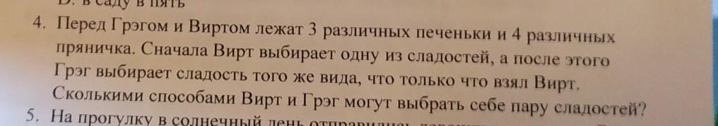 Рассмотрим два случая того, какую сладость могла выбрать Джуди. Случай 1. Предположим, что Джуди взяла печеньку. Сделать это она могла тремя способами. После чего перед Ником остаются 2 печеньки, из которых надо выбрать одну. Это можно сделать двумя способами. Получается, что если Джуди выбрала первую печеньку, то Ник может выбрать вторую или третью, если Джуди выбрала вторую печеньку, то Ник может выбрать первую или третью, и если Джуди выбрала третью печеньку, то Ник может выбрать первую или вторую печеньку. Таким образом, мы получаем 2+2+2=6 способов выбрать Джуди и Нику по одной печеньке. Случай 2. Предположим, что Джуди взяла пряничек. Тогда в любом случае перед Ником остаются три пряничка на выбор, значит, он сможет свой пряничек взять 3 способами. Итак, если Джуди берет себе первый пряничек, то у Ника 3 способа выбрать себе пряник, если Джуди берет себе второй пряничек, то снова 3 способа выбрать пряничек у Ника, аналогично если Джуди берет себе третий пряничек, то у Ника опять 3 способа выбрать пряничек, и наконец если Джуди берет себе четвертый пряничек, то у Ника 3 способа выбрать себе пряничек. При этом это все разные случаи того, какой пряничек выбирала Джуди, и в зависимости от ее выбора мы посчитали, сколько способов выбрать пряничек есть у Ника. Поэтому теперь осталось все способы сложить, так как все это были разные случаи выбора пряничка Джуди. Получаем 3+3+3+3=12 способов выбрать по одному пряничку Джуди и Нику. Эти количества способов, 6 и 12, представляют собой разные случаи того, какие же именно сладости берут друзья — печеньки или прянички. А так как они могут выбрать любой тип сладости, то чтобы получить все способы выбрать две сладости, эти количества способов, 6 и 12, надо сложить: 6+12=18, это и есть суммарное количество способов выбрать по одной сладости Джуди и Нику одинакового вида.