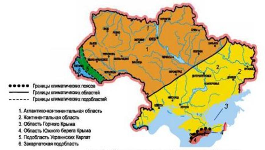 Количество климатических подобластей умеренного климатического пояса, в которых располагается территория Украины-две.Это атлантико-континентальная подобласть и континентальная (на юго-востоке).