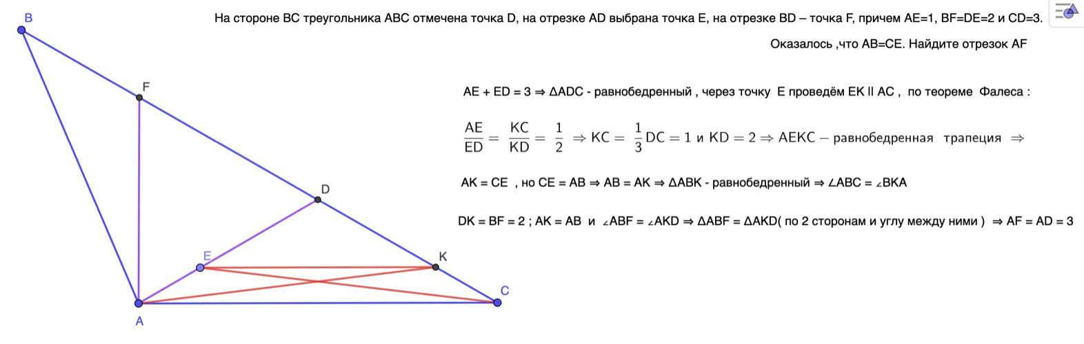 На стороне ВС треугольника АВС отмечена точка D, на отрезке АD выбрана точка Е, на отрезке BD – точка F, причем АЕ=1, ВF=DЕ=2 и СD=3. Оказалось я. Что АВ=СЕ. Найдите отрезок АF