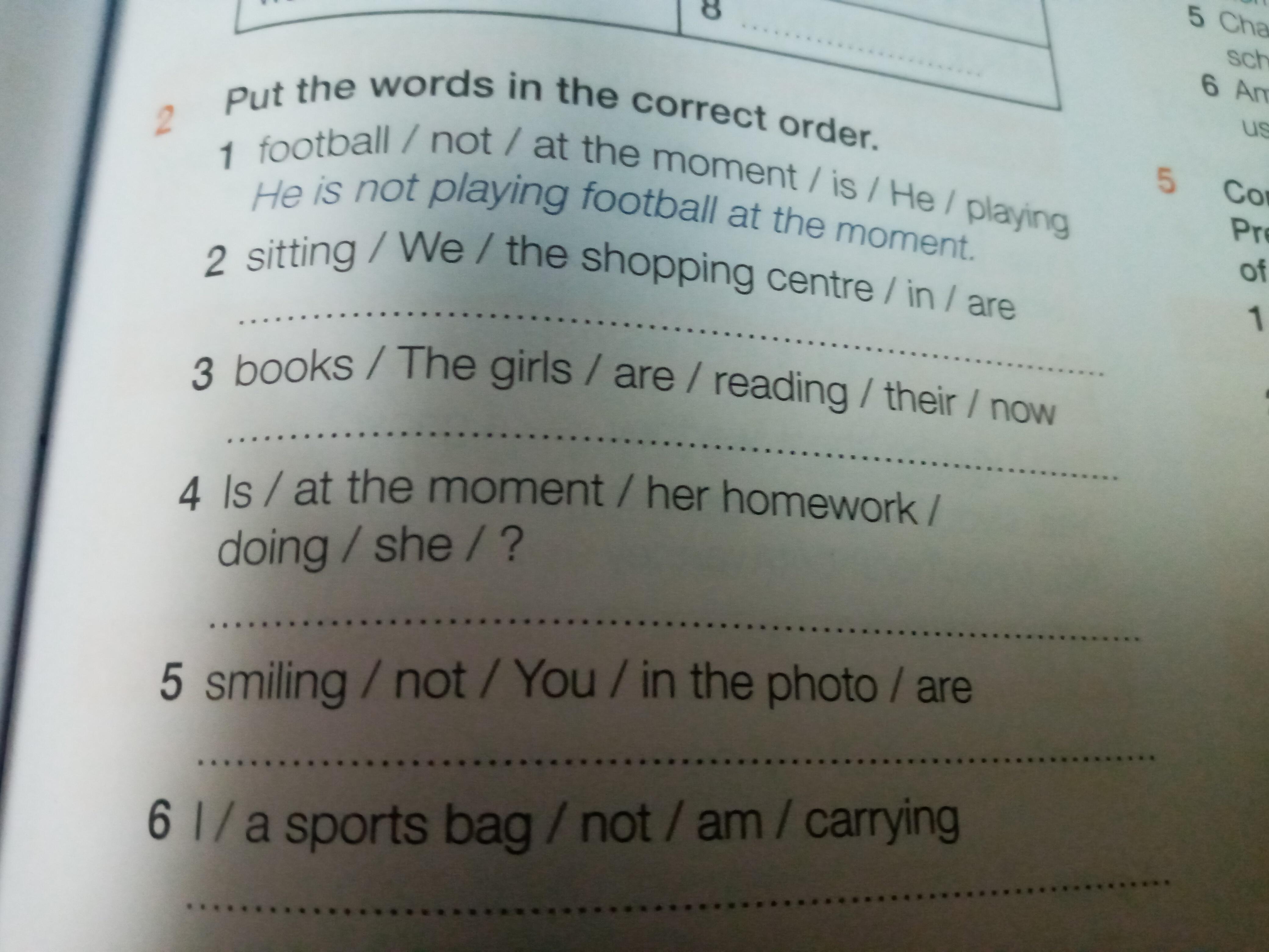 4)Is doing she her homework at the moment