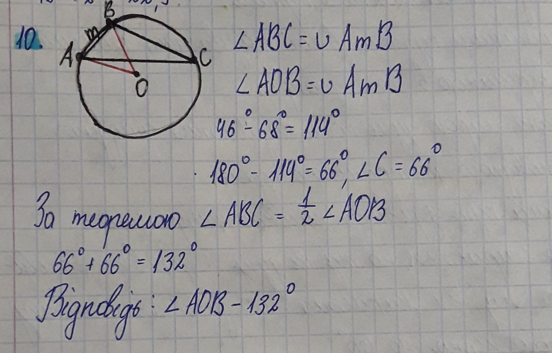 У трикутнику АВС кут А = 46 градусів, кут В = 68 градусів, точка О - центр описаного кола. Знайдіть кут АОВ. Записати розв'язання.